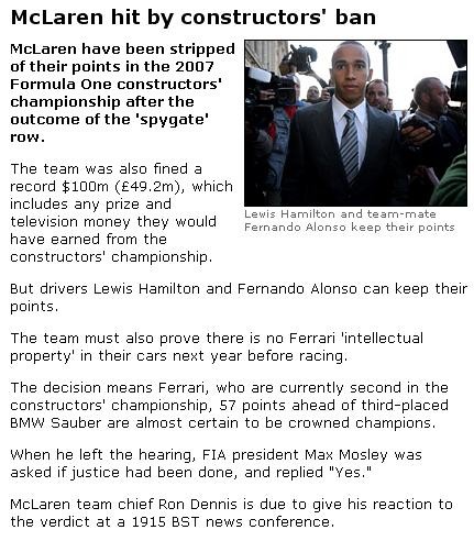 By spying on Ferrari their driver won the race so their points should also be deducted. Well ther might be argument that it was not drivers fault but they used the car, so drivers point also should be deducted.
