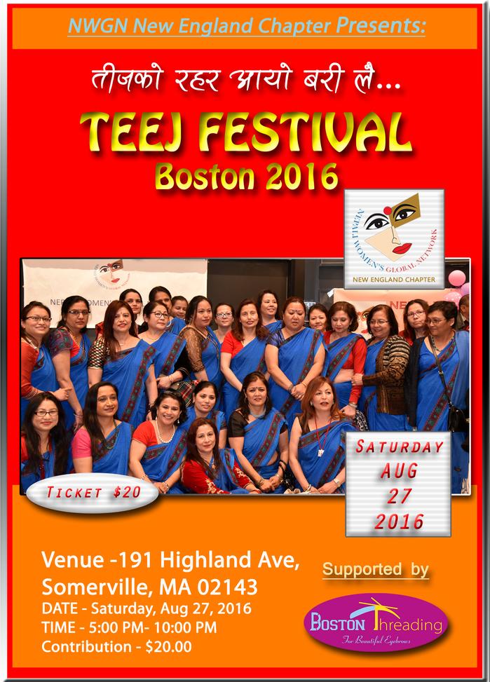 तीजको रहर आयो बरी लै... नेपाली महिलाहरूको विशेष पर्व तीज यस पटकदेखि NWGN New England Chapterले बोस्टनमा मनाउन लागेकोले सम्पूर्ण महिला दिदीबहिनीहरूलाई सहभागी भएर नाच्न, गाउन र रमाइलो गर्न हार्दिक निमन्त्रणा गर्दछौँ ।